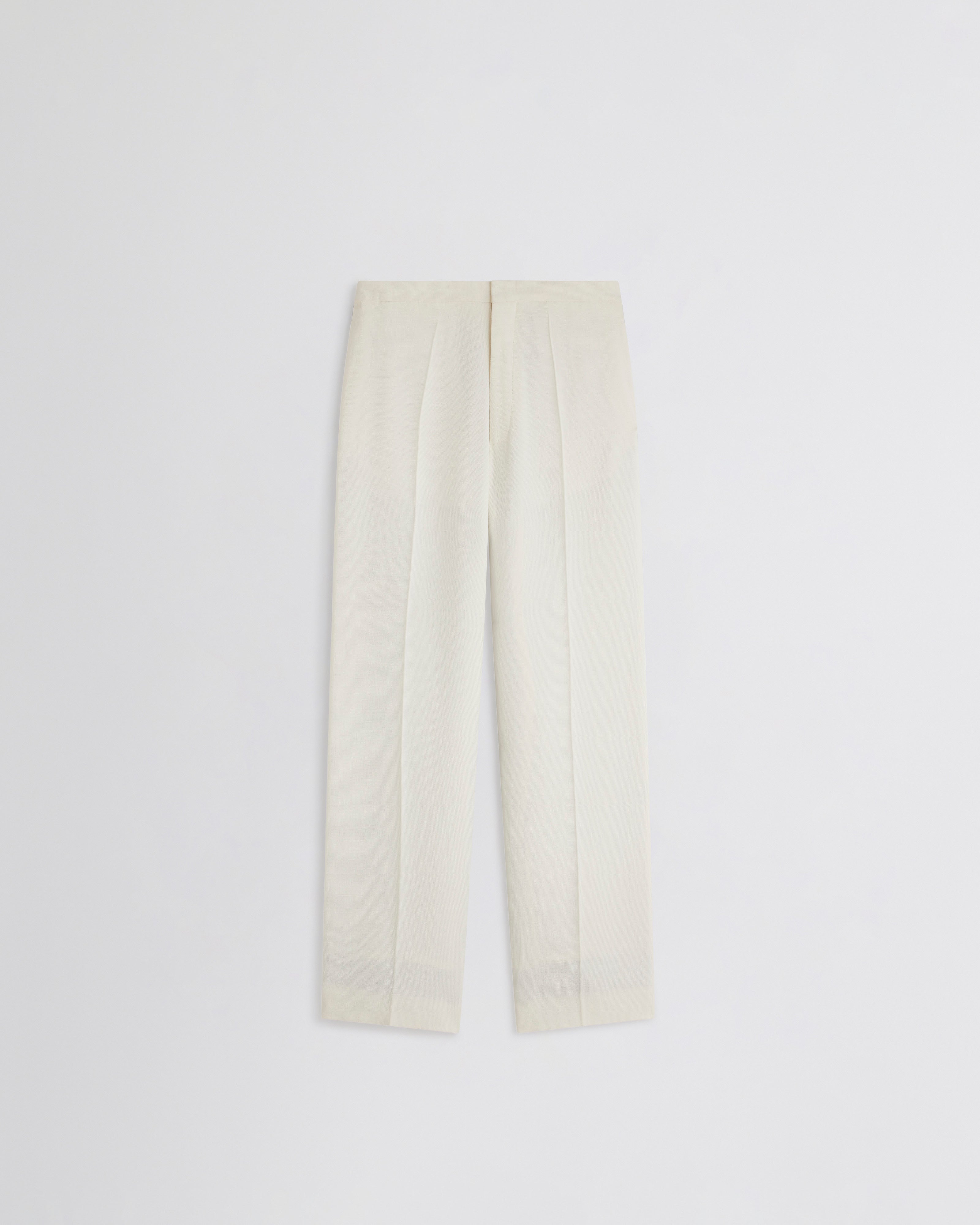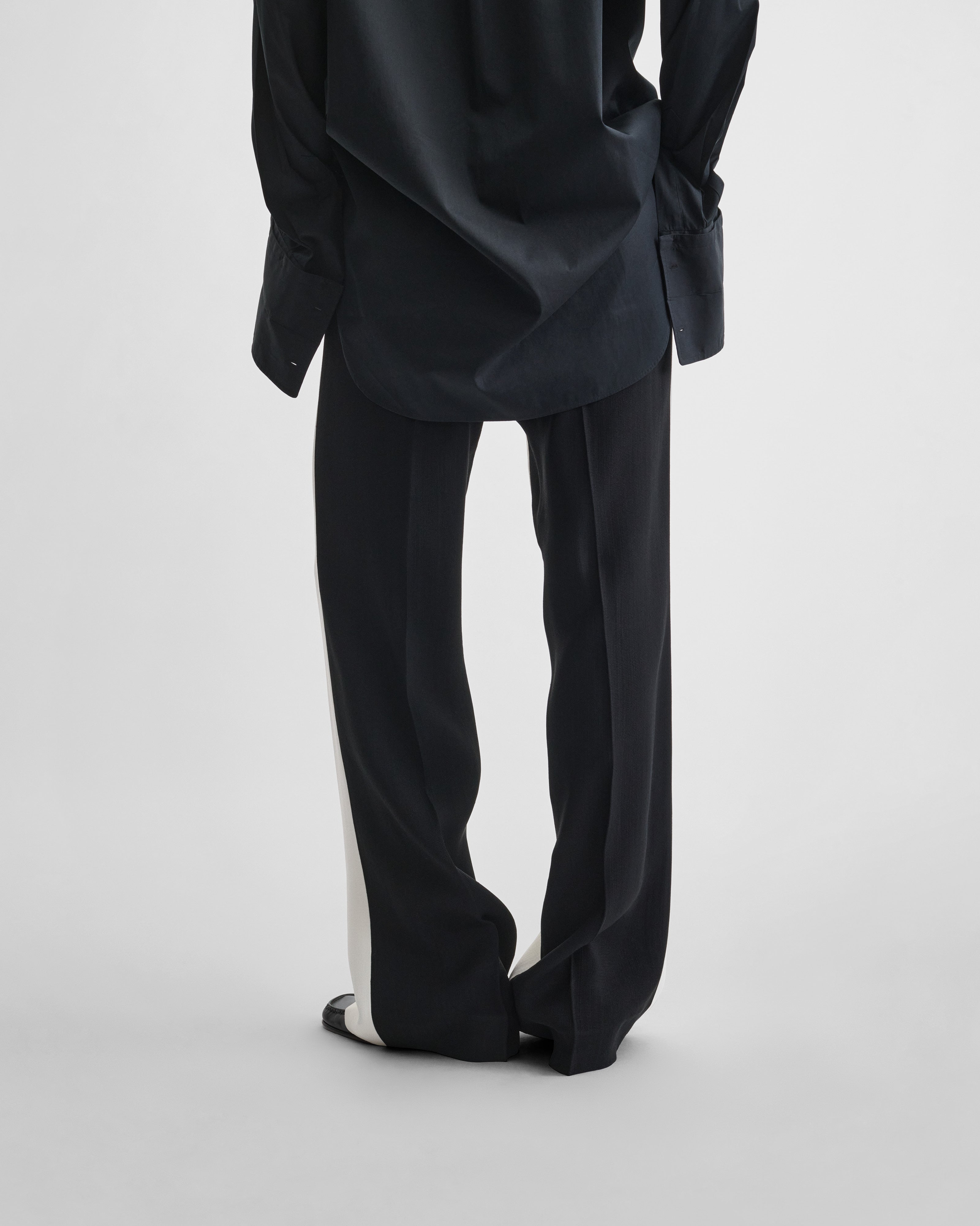 Bi-colour trousers in black and off-white woven viscose. Cut to sit low on the waist, the trousers have a boyish slouch and a satin tuxedo sideband running the length of the leg. The textured viscose-silk tailoring has a dry hand and a washed finish. Unlined.