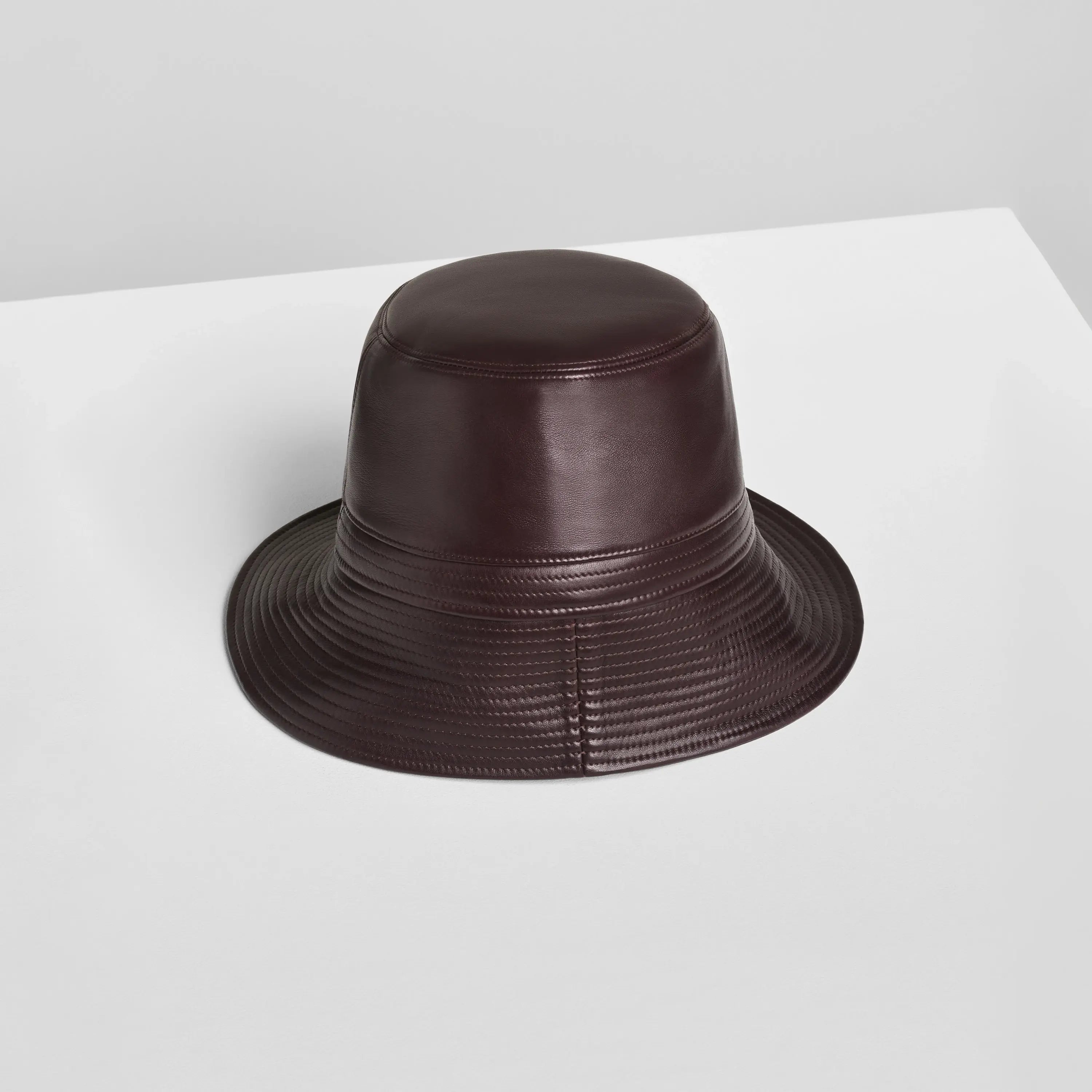 Bucket hat in dark berry leather. Exaggerated high crown and asymmetric brim which can be flipped up or down. Supple leather with a matte finish.