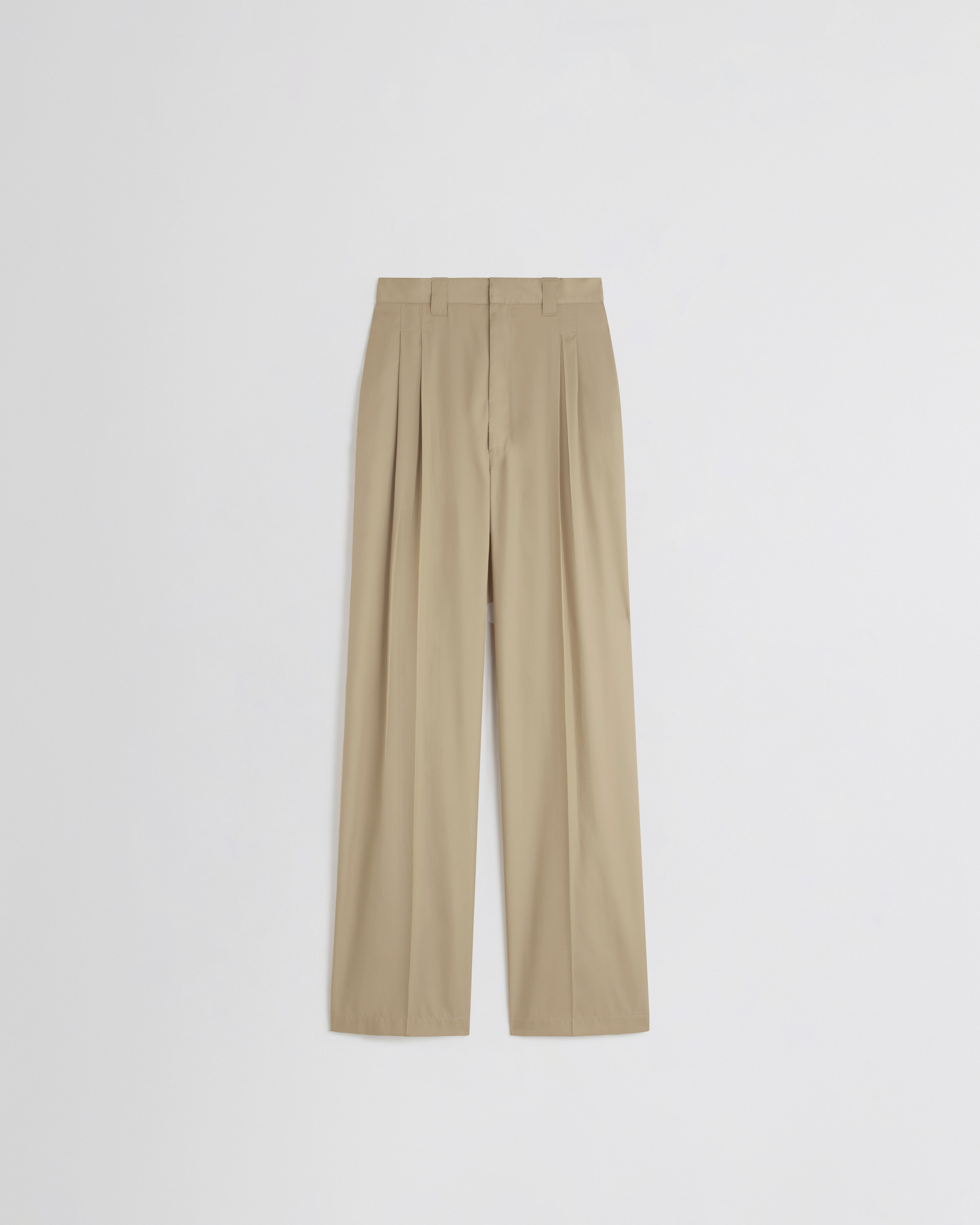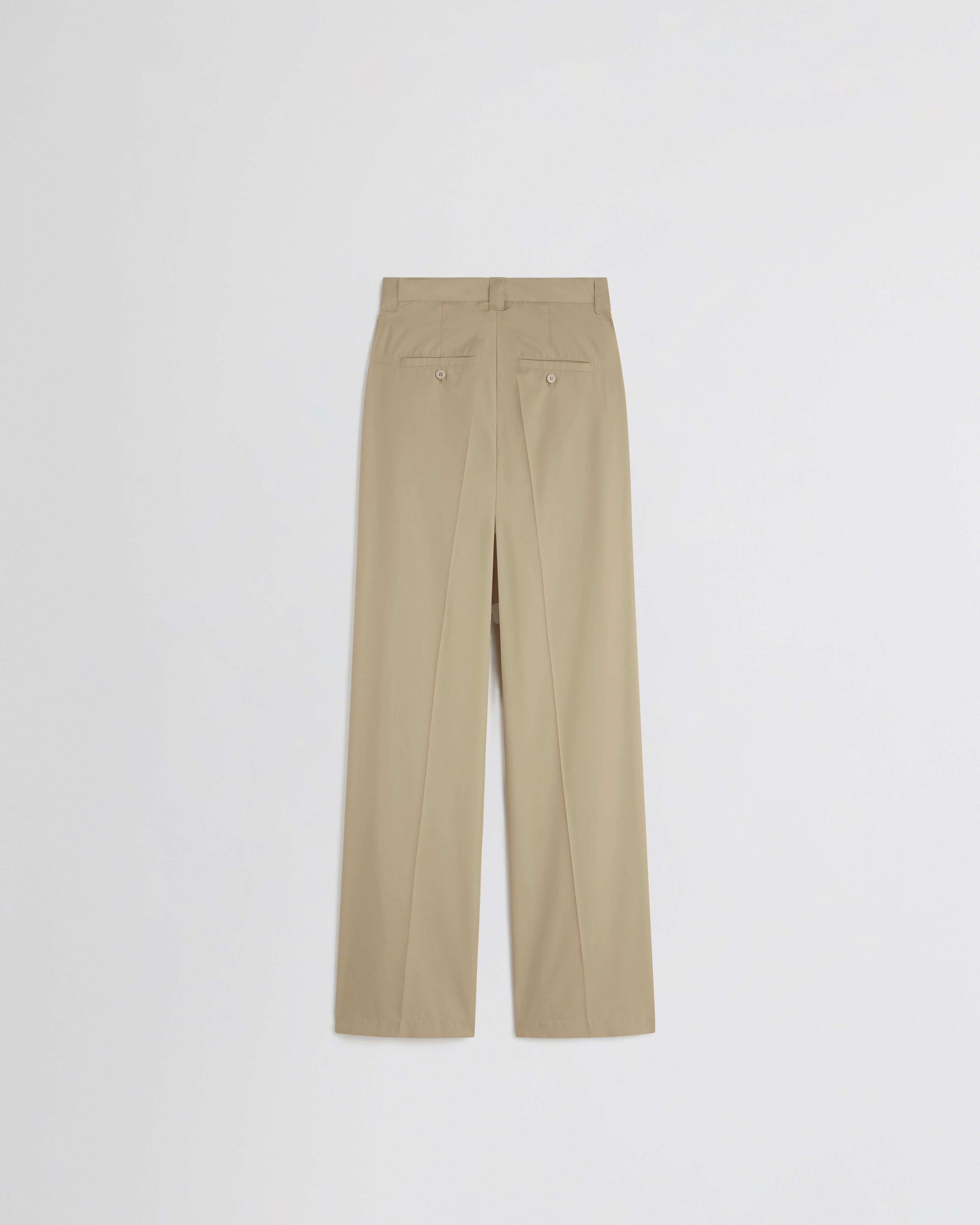Chino trousers in trench poly twill with double pleats at the front. Cut for a classic fit with a gentle slouch. The sharp pressed fabric creates an intentional crease detailing and has a peachy hand.