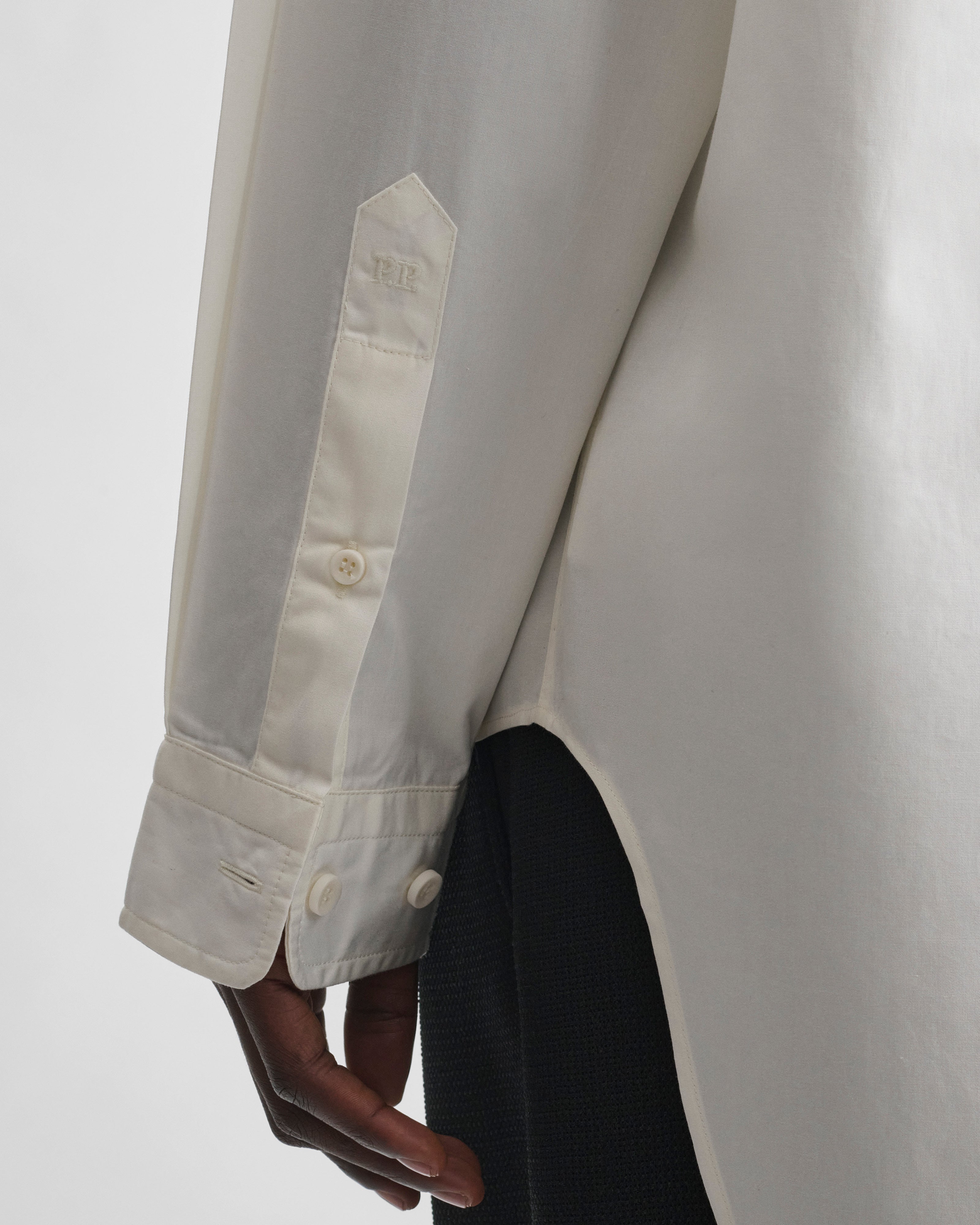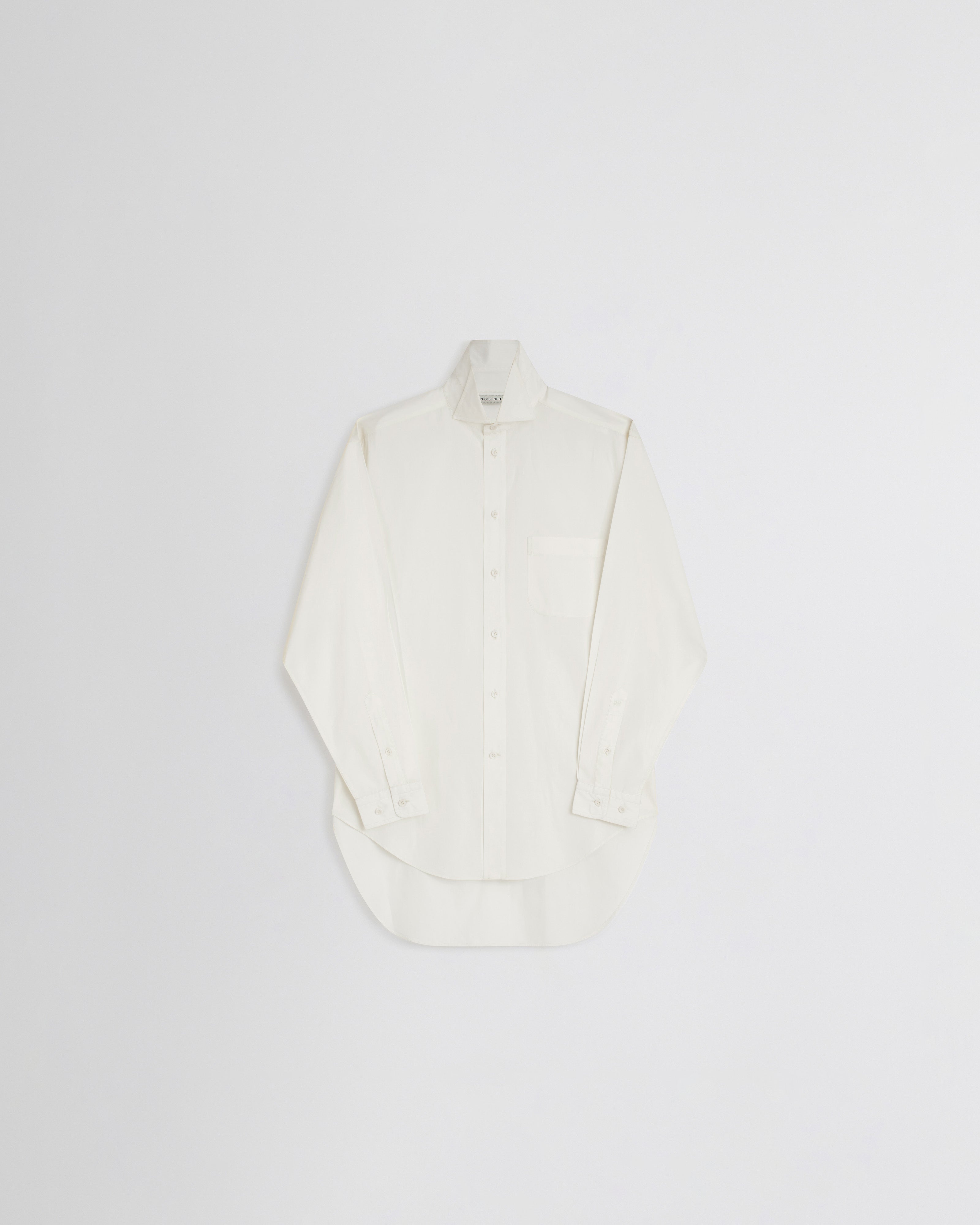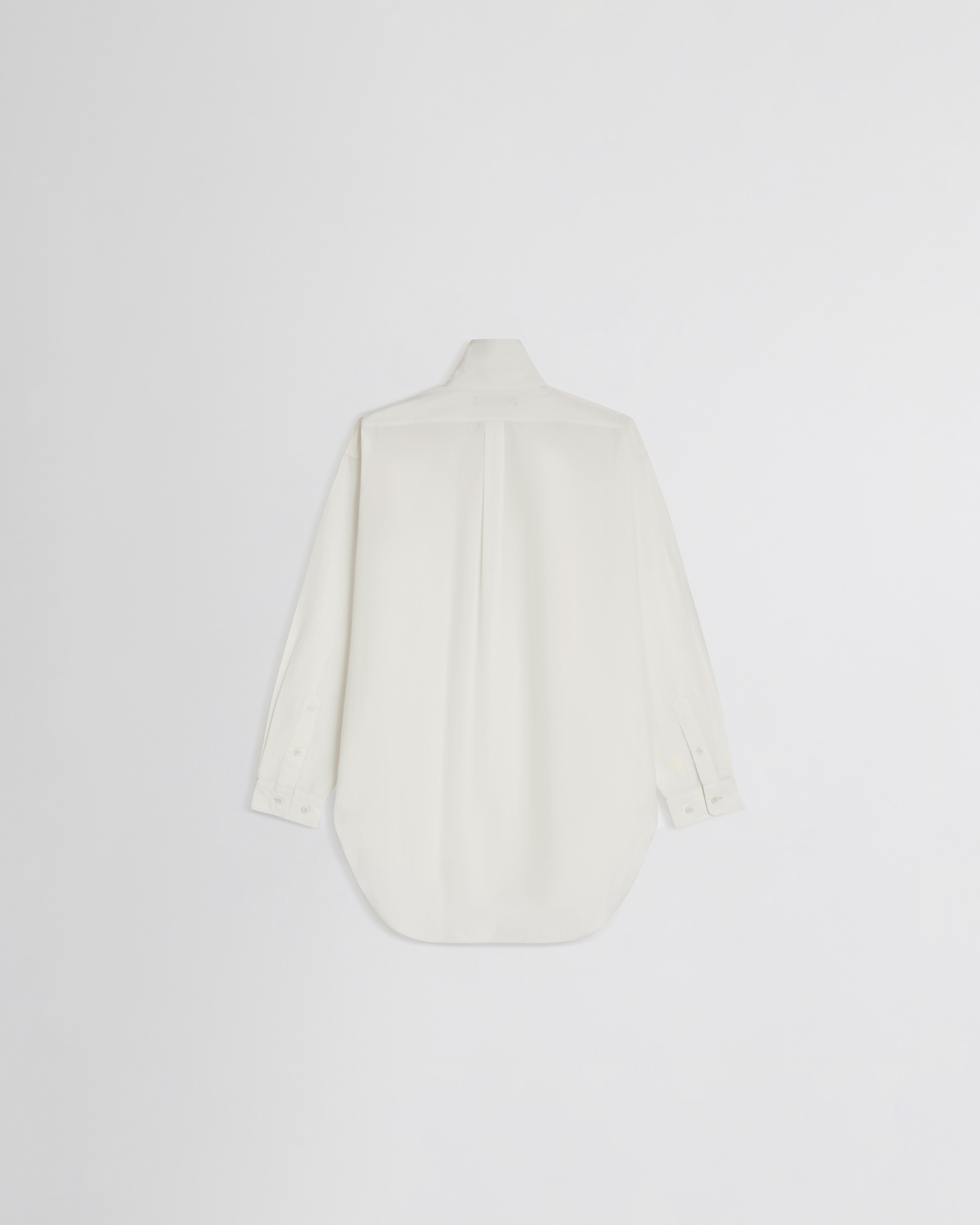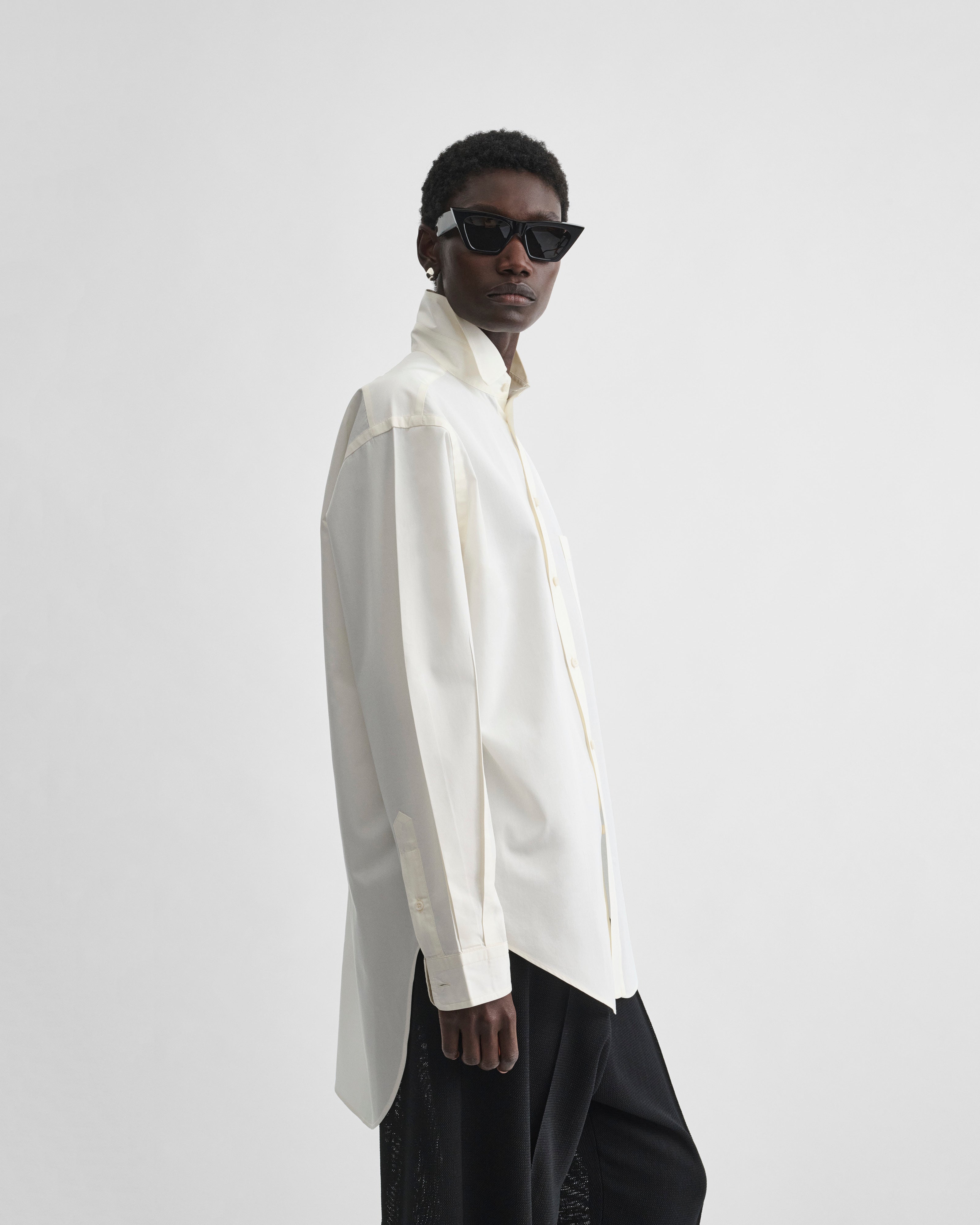 Upright-collar shirt in ivory cotton poplin. The shirt has an eased masculine fit. The fabric has been washed for a soft, laundered effect.