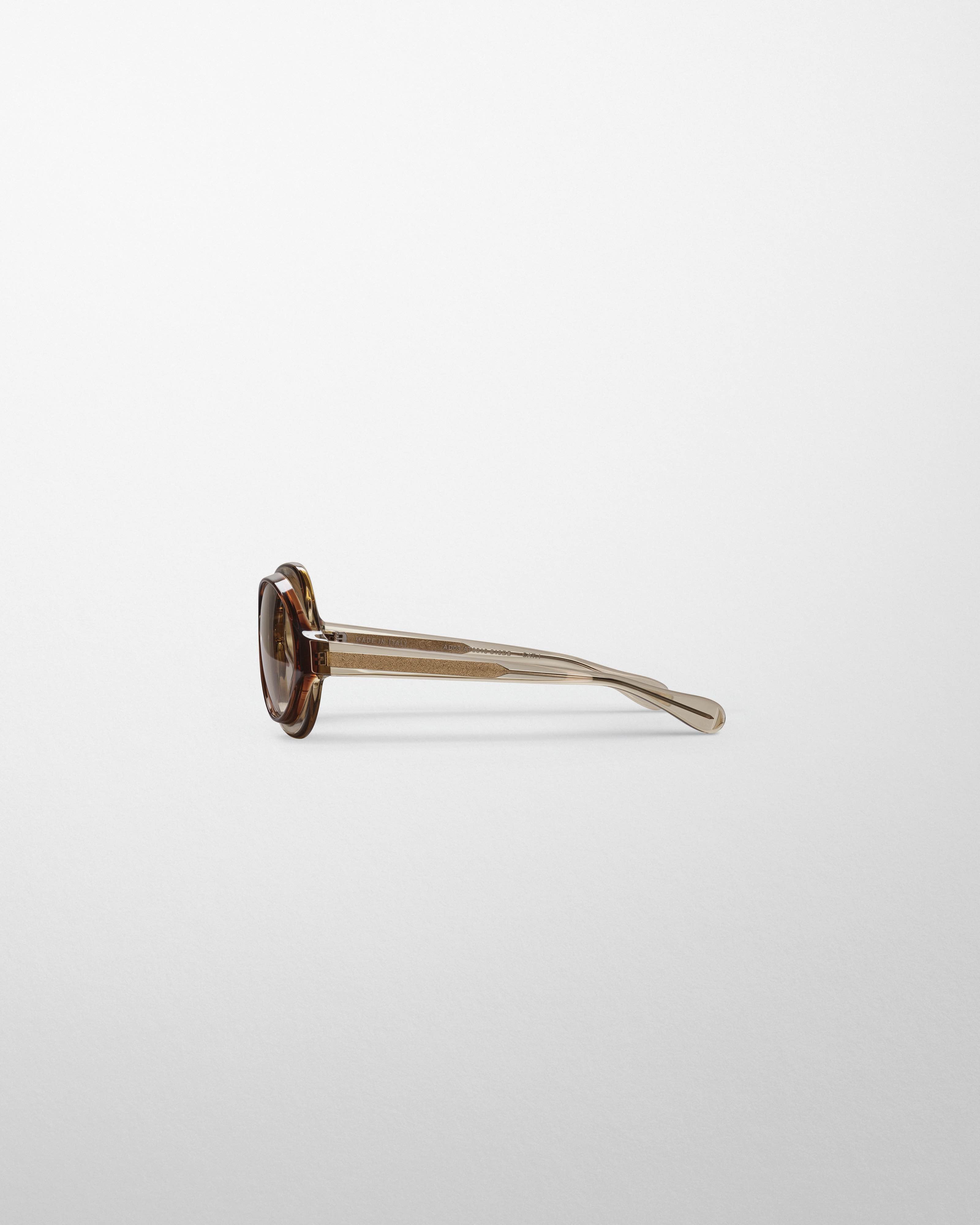 Cookie sunglasses with light taupe lenses, smoked frames and narrow temples. Curved acetate rim on the outer frames creates the impression of extended lenses. Adapted from an original 1969 style by designer Philippe Chevalier.