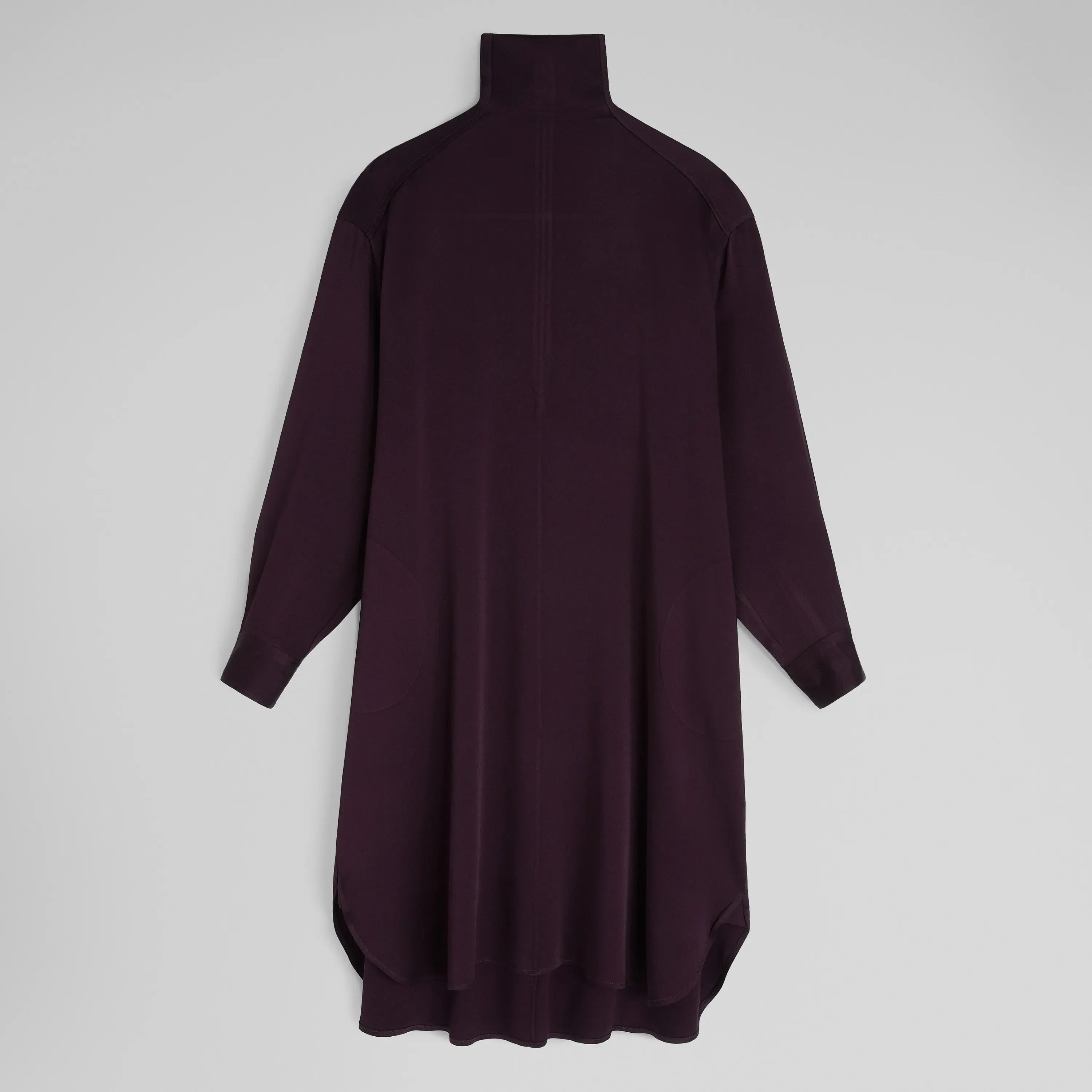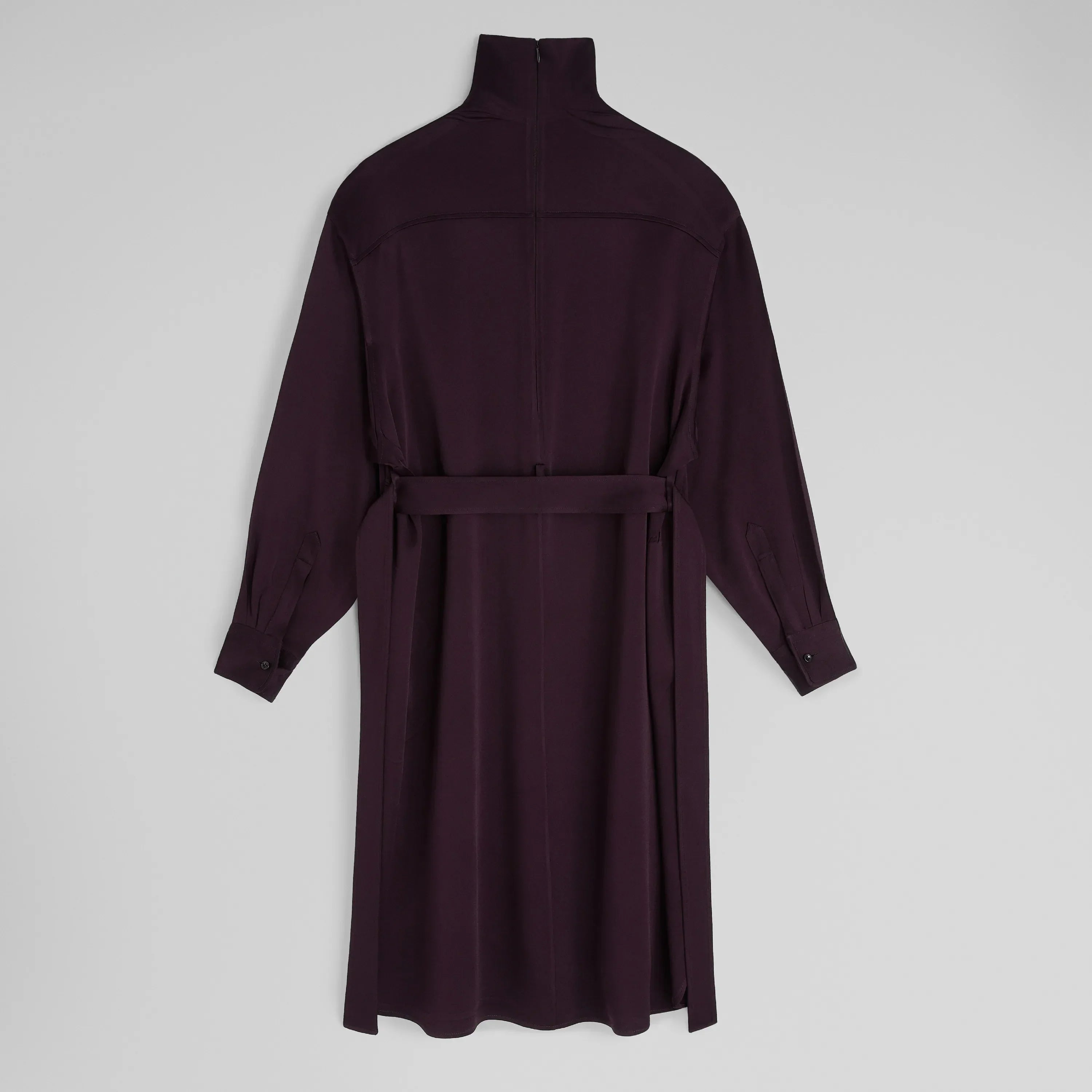 Dress in dark berry viscose blend satin-back crepe. The dress has a loose fit, high neck and belt. The acetate viscose blend creates a high-shine surface.