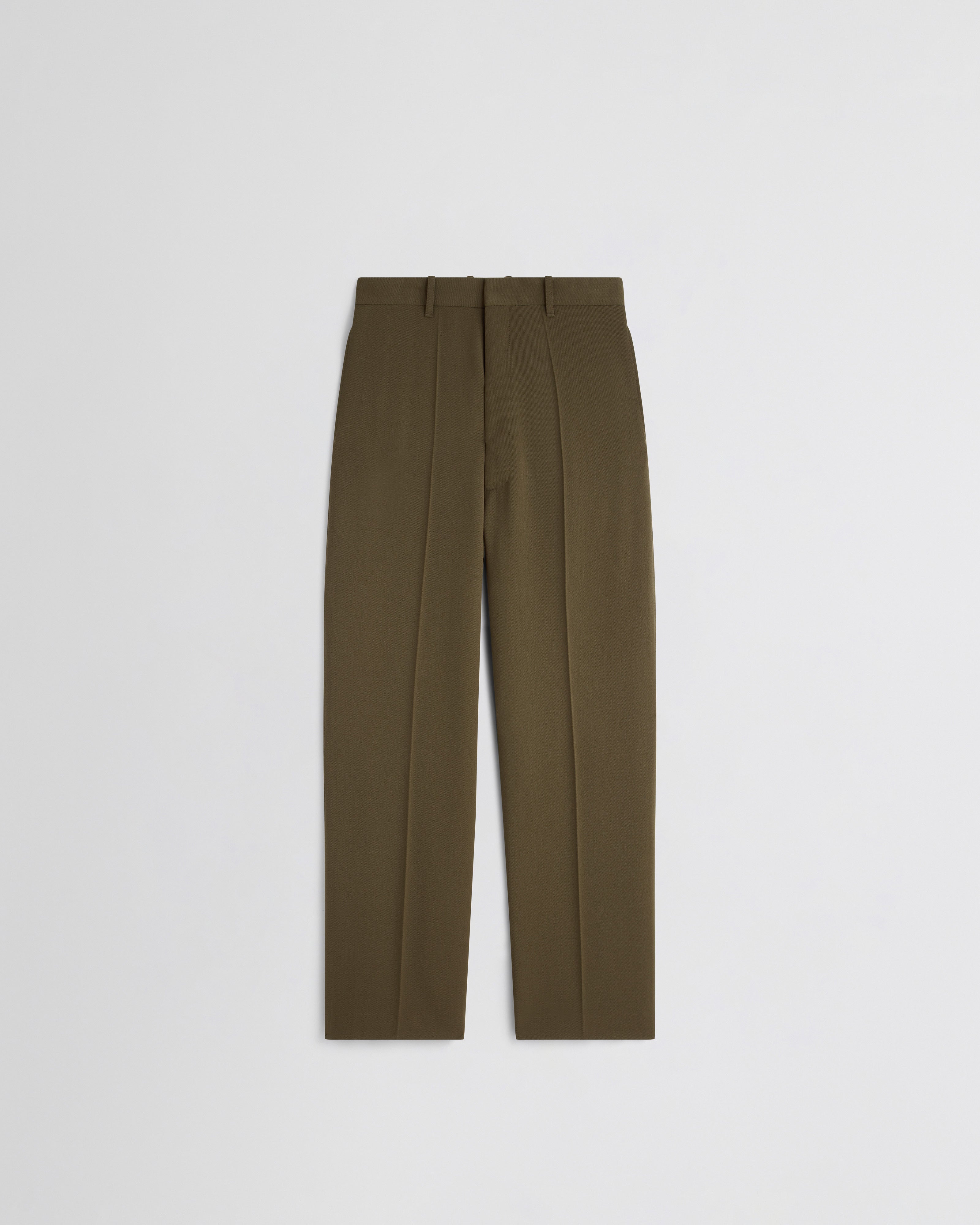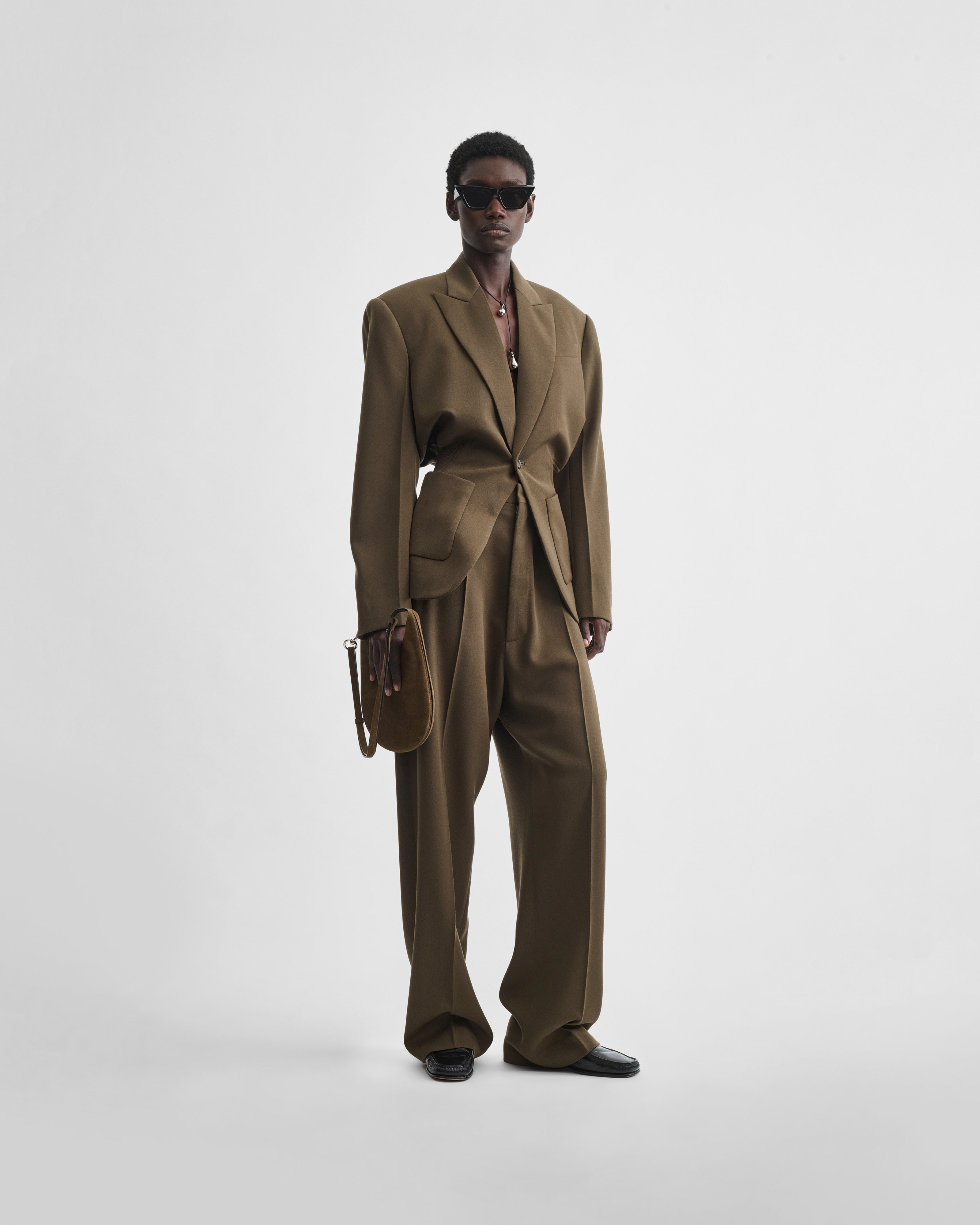 Tailored trousers in shroom wool. The trousers have a men’s suiting touch: an airy eased fit, a wide leg, ride low on the hips and pool at the ankles. Partially lined, from waist to knee.