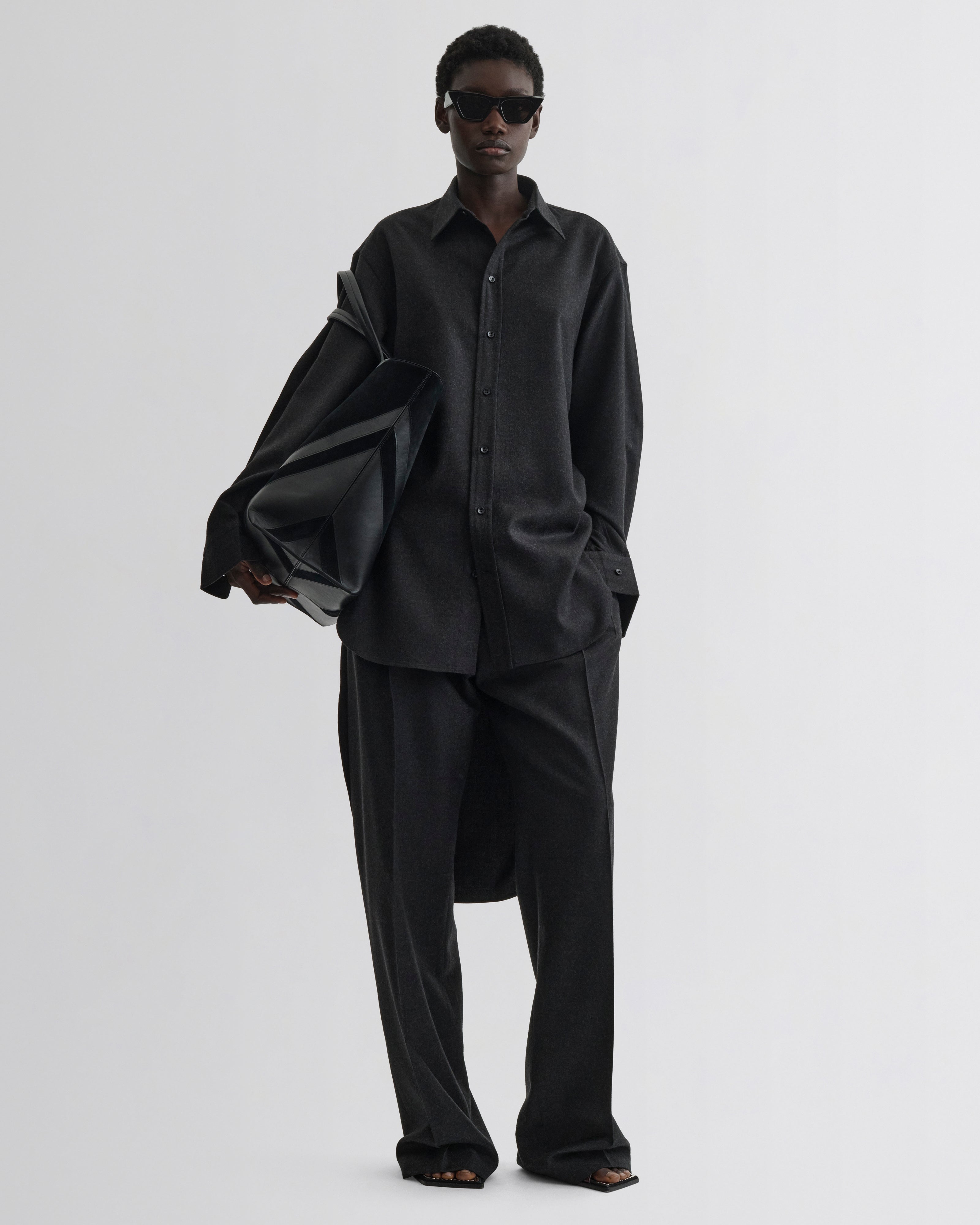 Asymmetric long sleeve shirt in charcoal wool tailoring. The eased design has a regular length front and long back. Collar and button fastenings. Fluid wool in a Prince of Wales check.