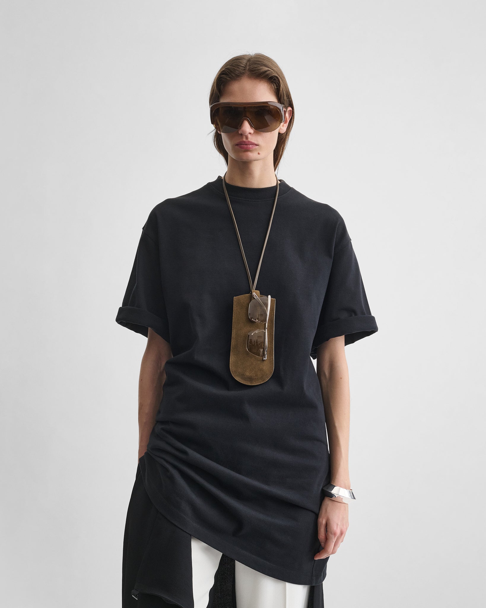 Glasses pouch in olive suede. Slim leather strap, magnetic tab fastening and a tonal leather interior.