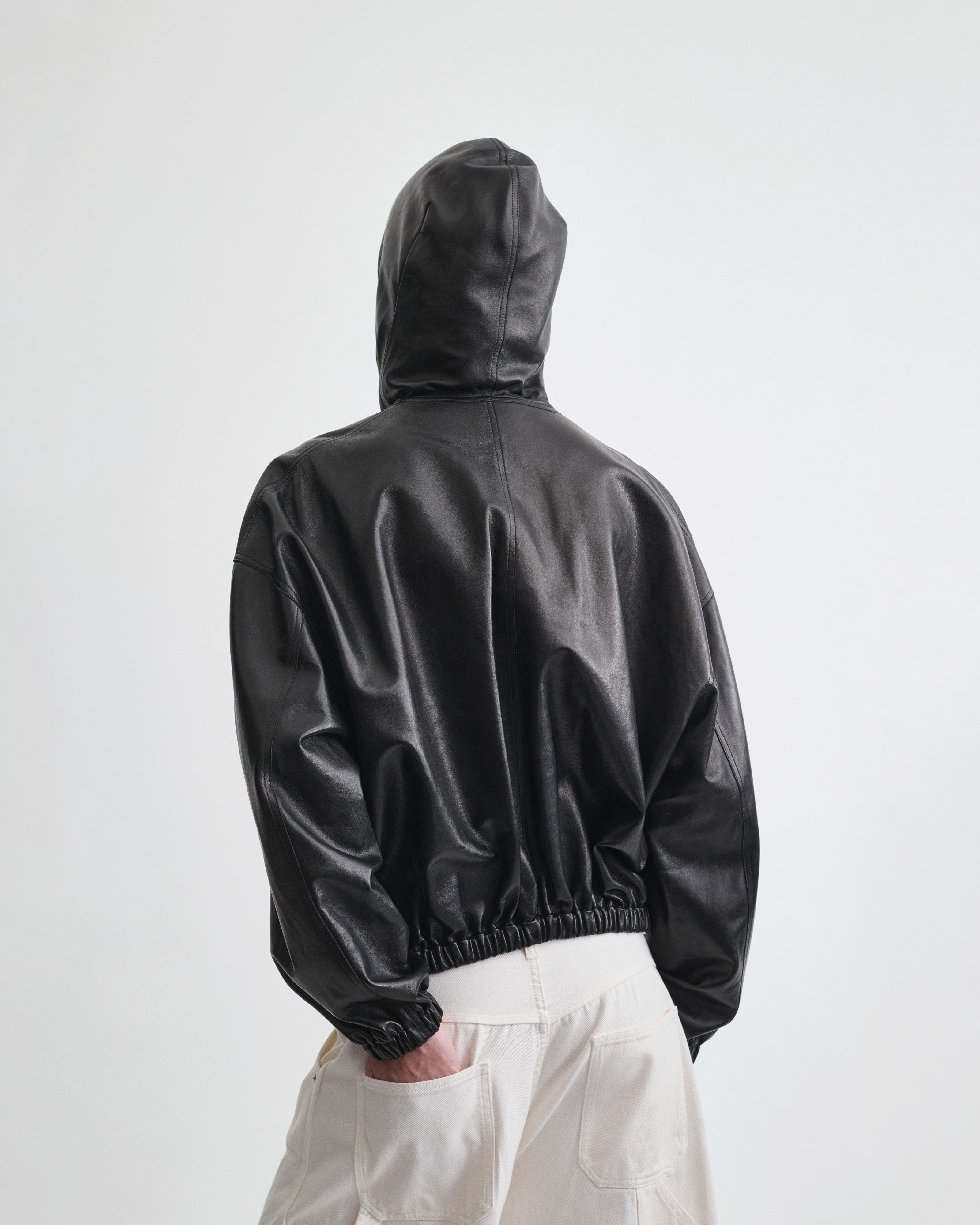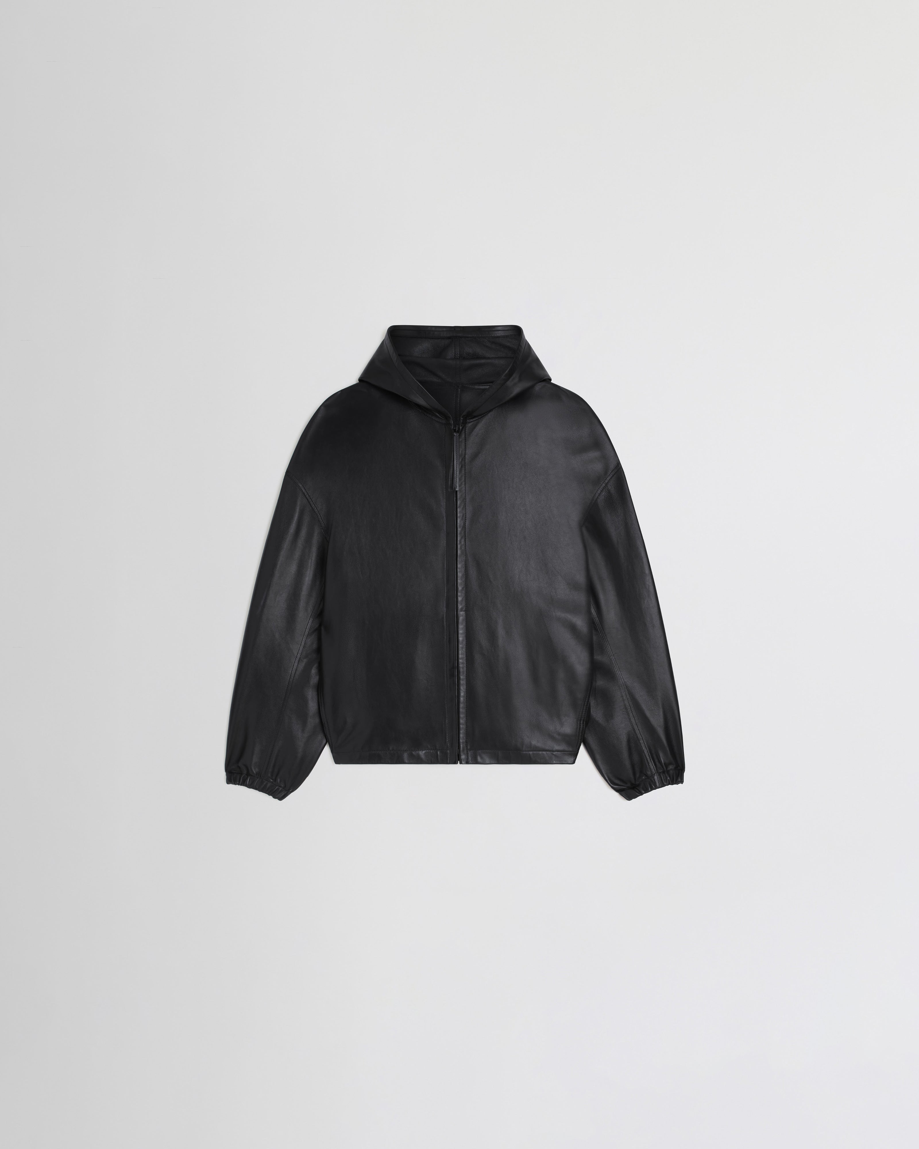 Hooded bomber jacket in black leather. Zip fastening, pockets at sides, elasticated cuffs and gathered hem. Unlined, the jacket is ultra lightweight. The plonge leather has a glossy, soft rubber look finish.