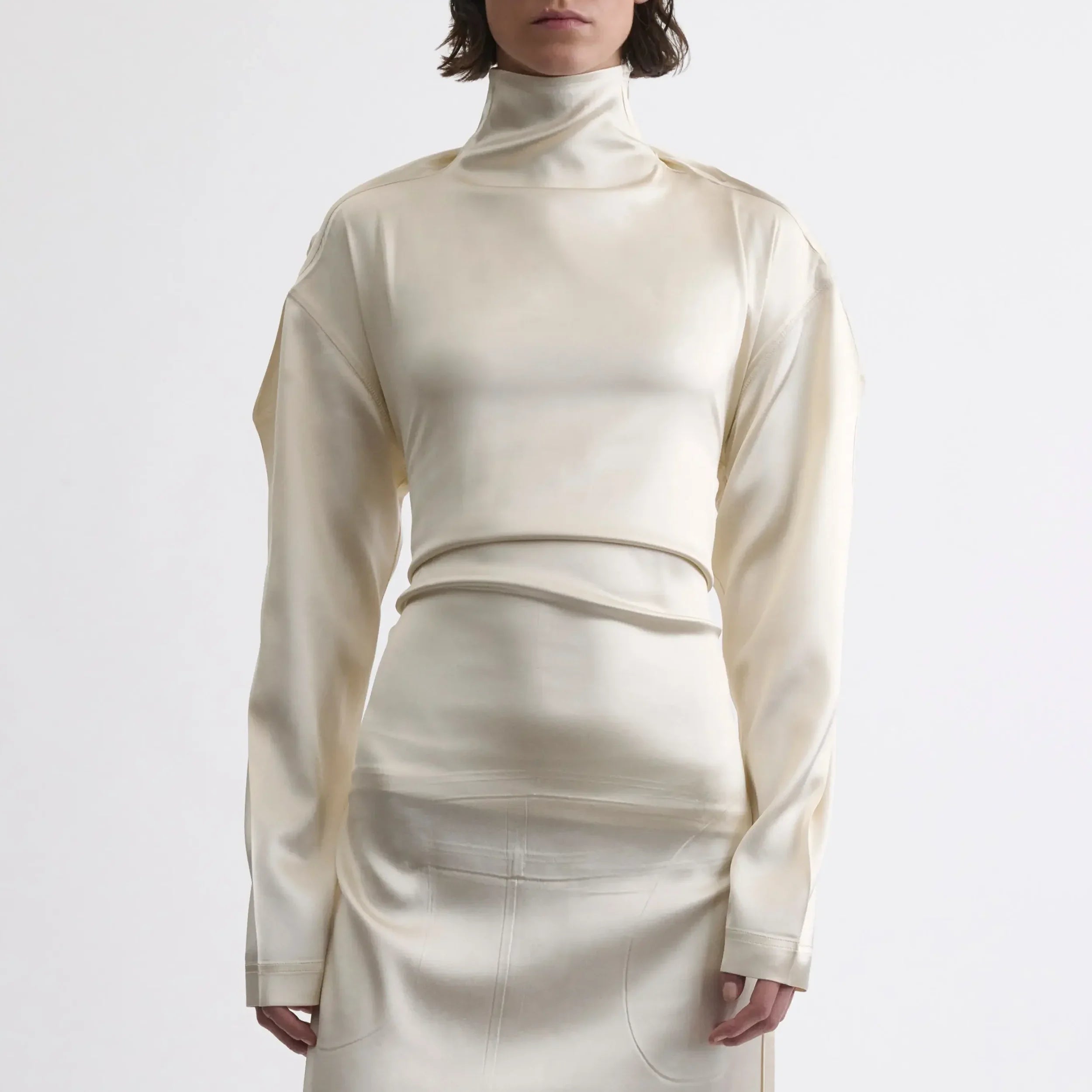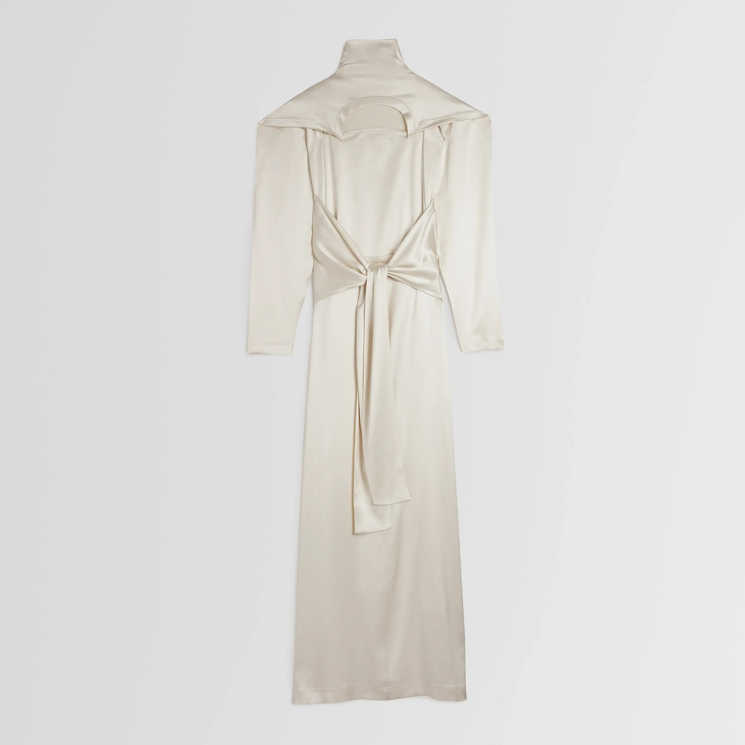 Long cream stretch satin dress with exposed back. With long sleeves and a high neck, the loose, easy fit and covered silhouette at the front contrasts with the revealing cut-out at the back. The deconstructed design has a sash and trompe l’oeil neck, and can be worn in a variety of ways. The dress has pockets at the sides and a zip fastening. The fluid fabric falls with a liquid drape.