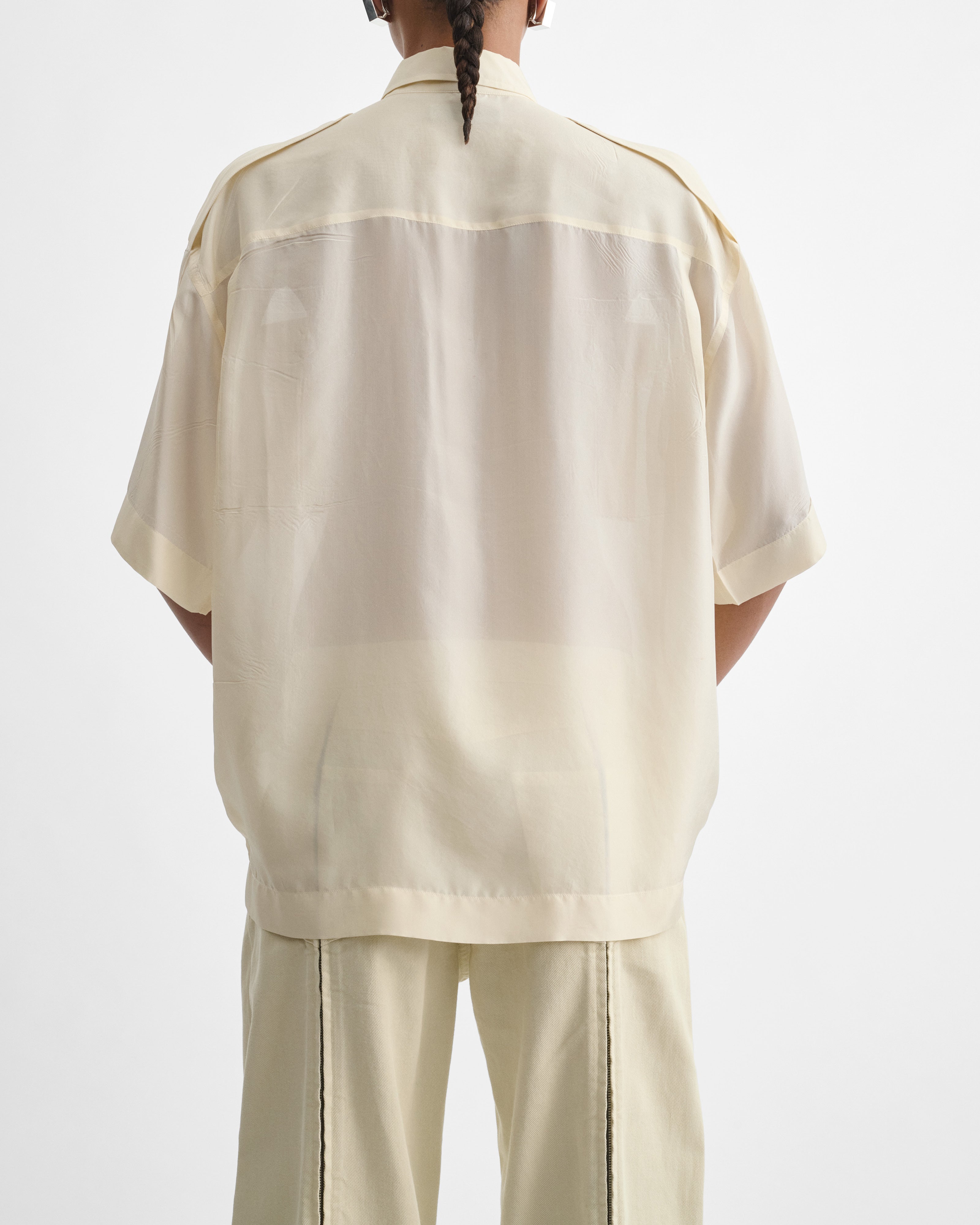Short sleeve shirt in vanilla habotai silk. Classic utility detailing offset by the lightweight fluid fabric, which is washed and pressed, with a subtle sheen. Patch pockets on the chest and button-fastening tabs on the shoulders.