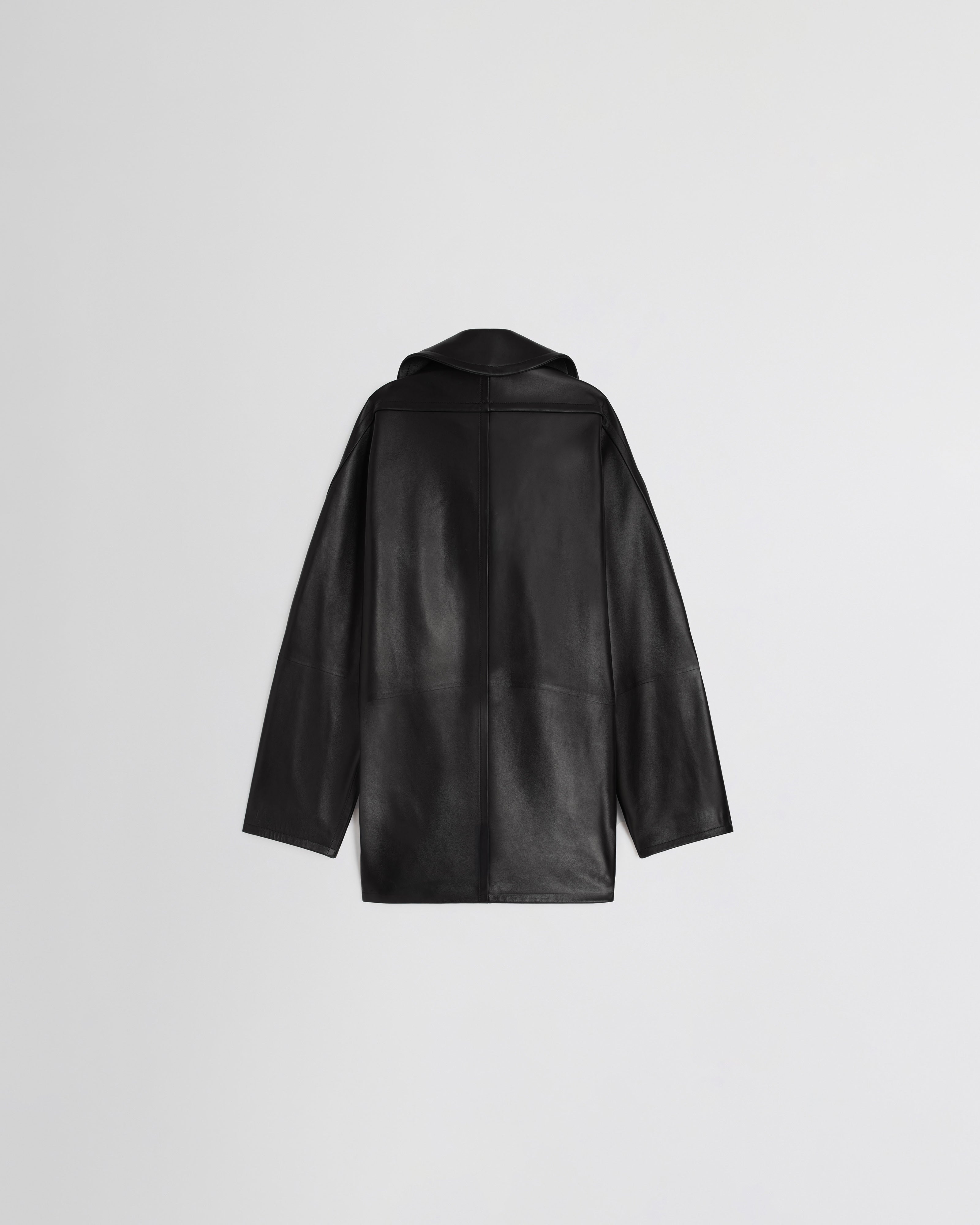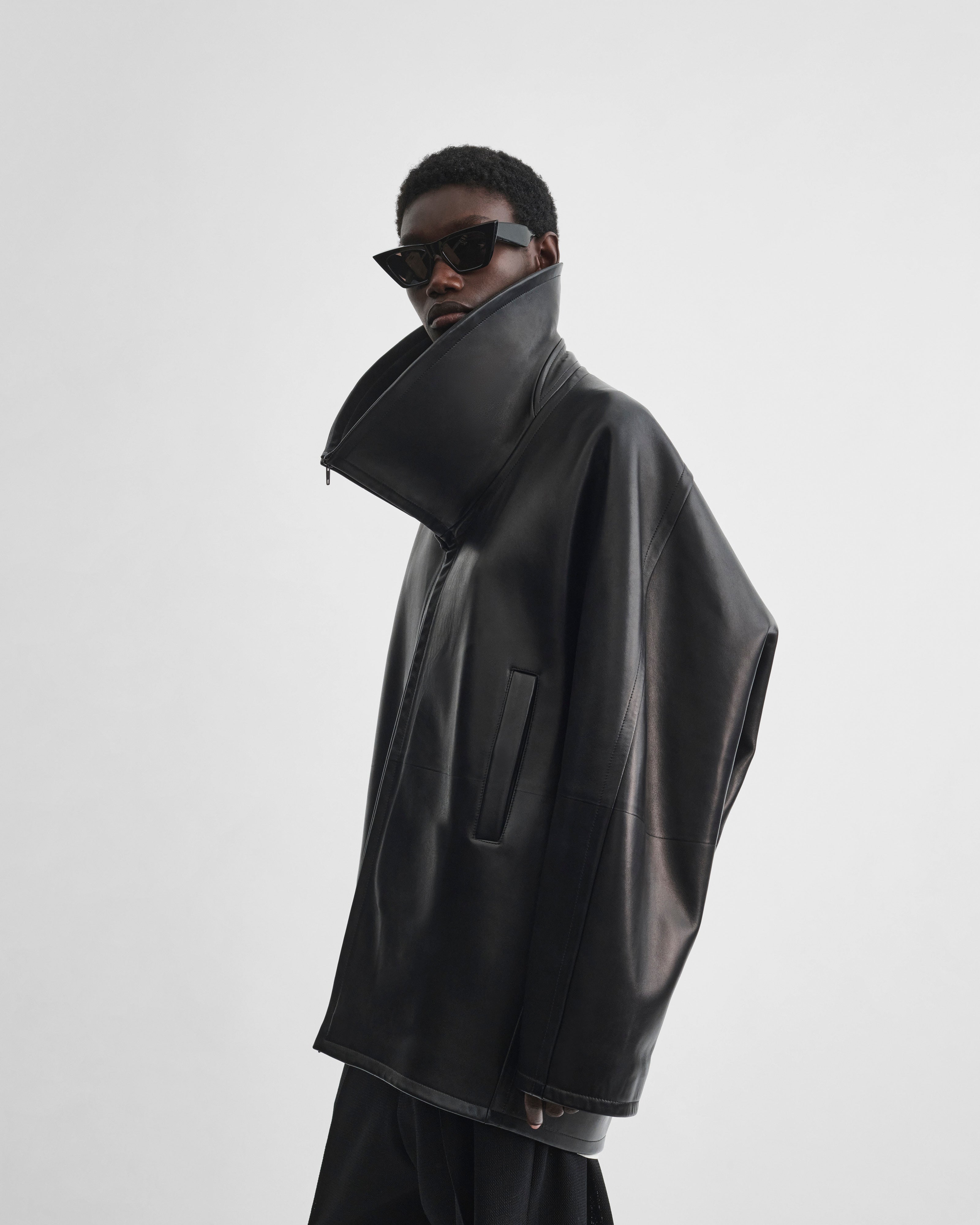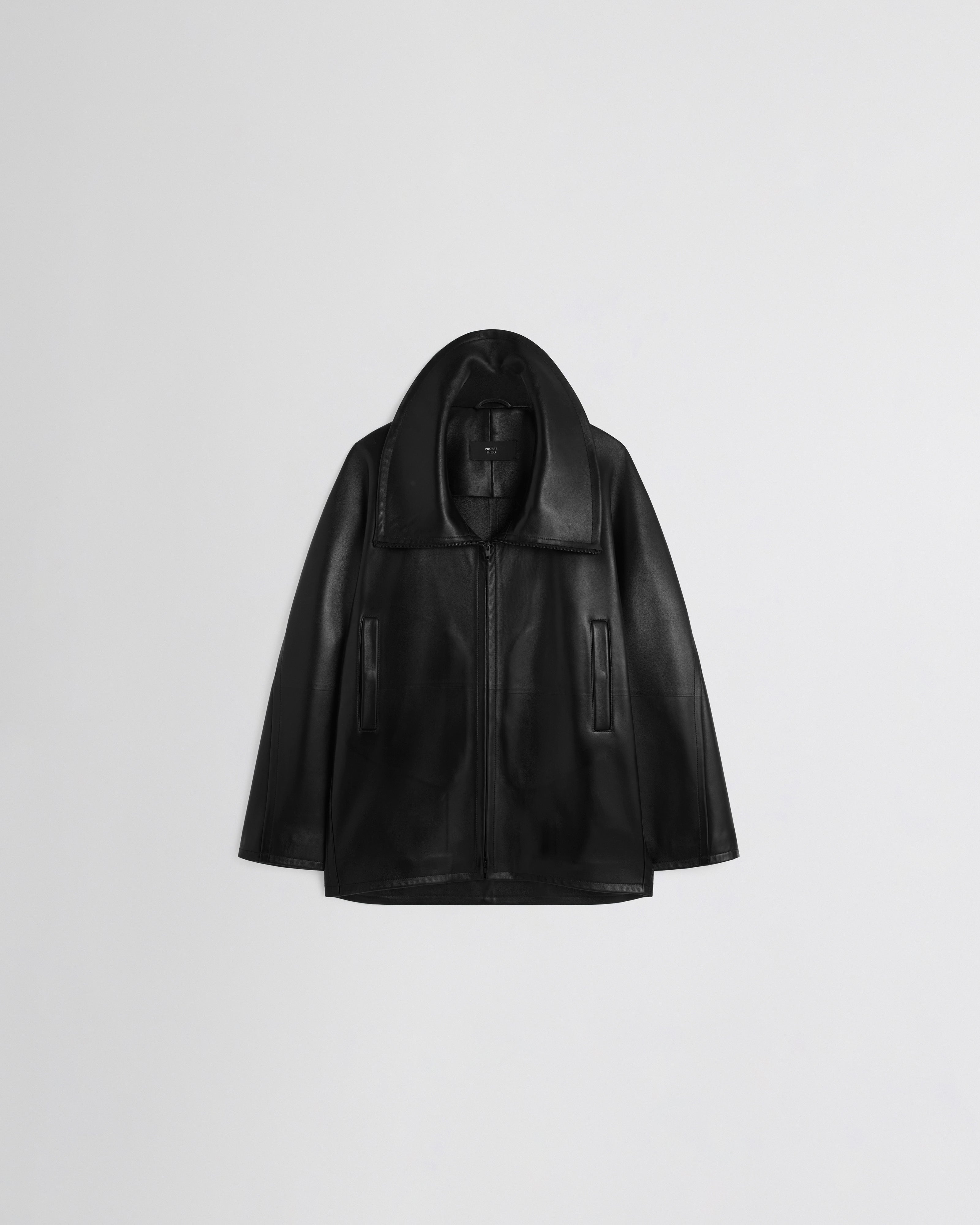 Swathe jacket in black leather. Cut for a generous fit, with the hem hitting the upper thigh, the jacket has an exaggerated funnel neck. Zip fastening and two welt pockets at the front with snap button closures. Hard pressed and unlined.