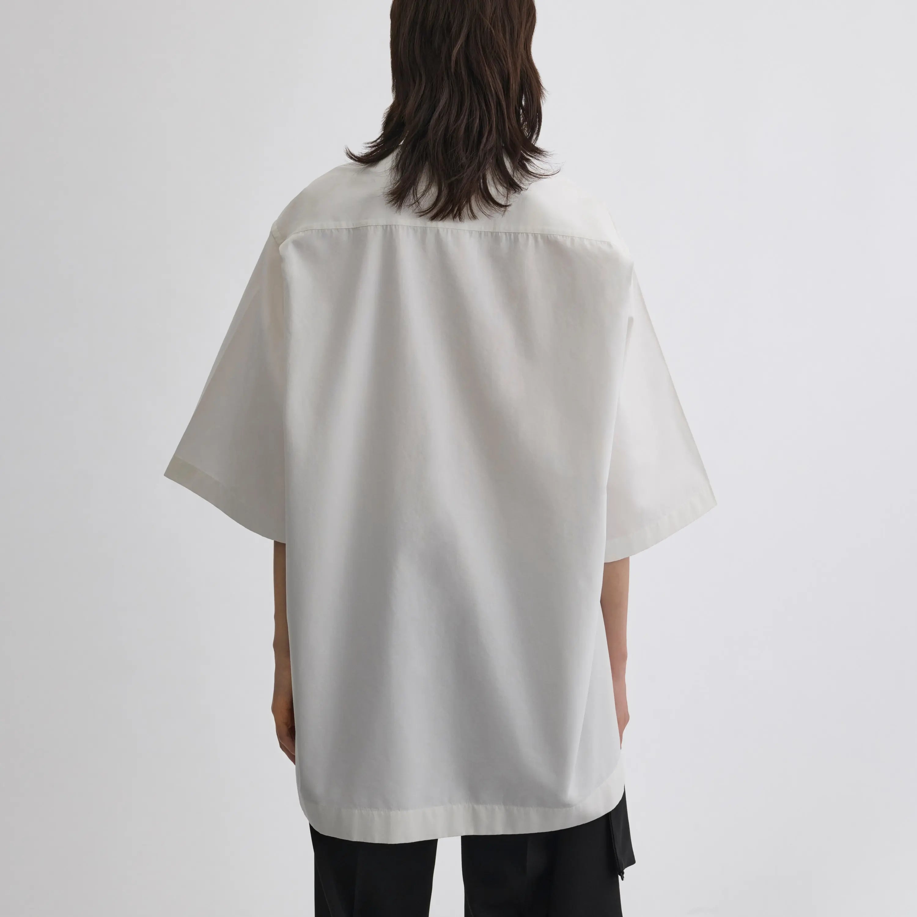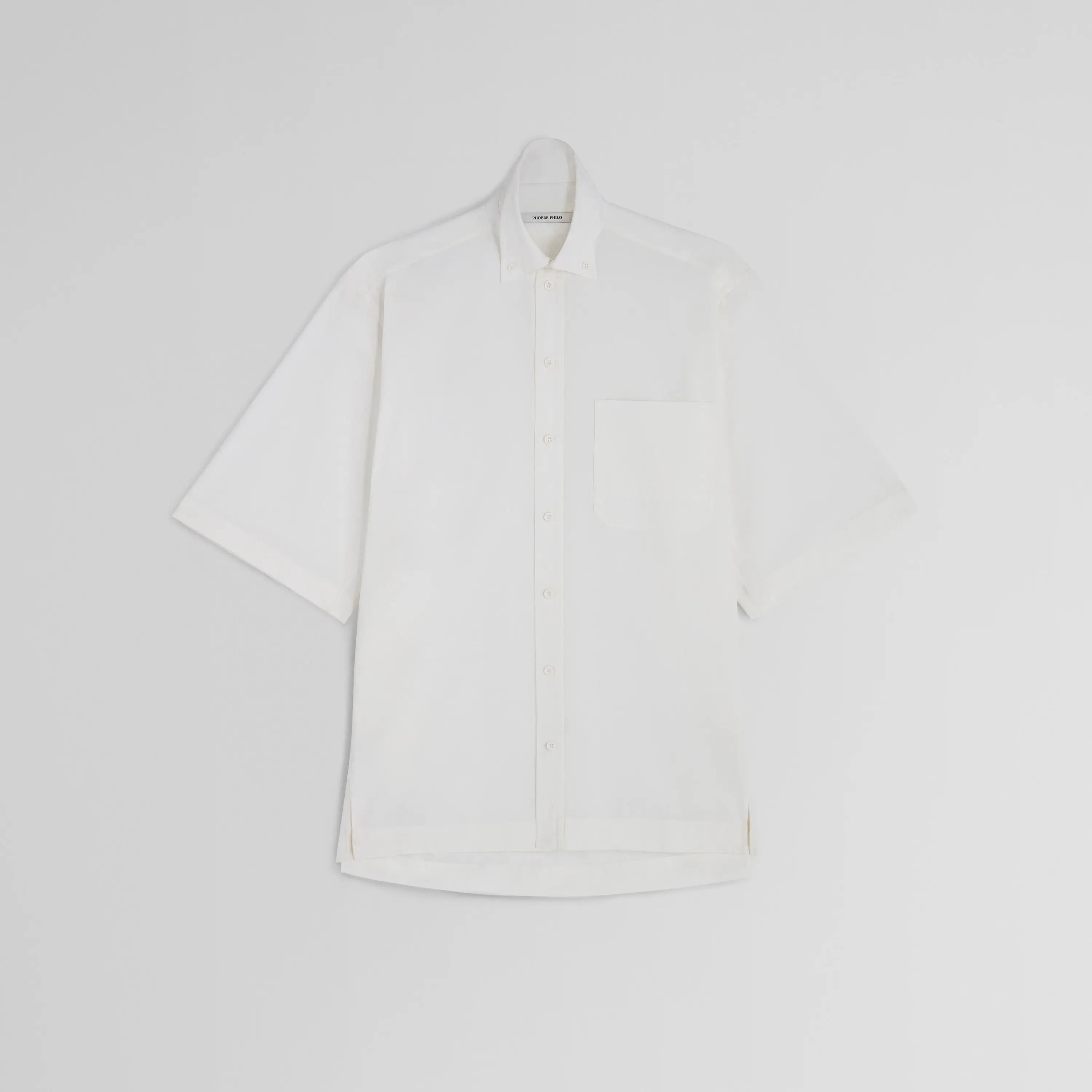 Uniform shirt in white cotton. Wide, elbow-length sleeves, patch pocket on the chest and an upright-collar with buttons. The cotton is washed for a soft finish.
