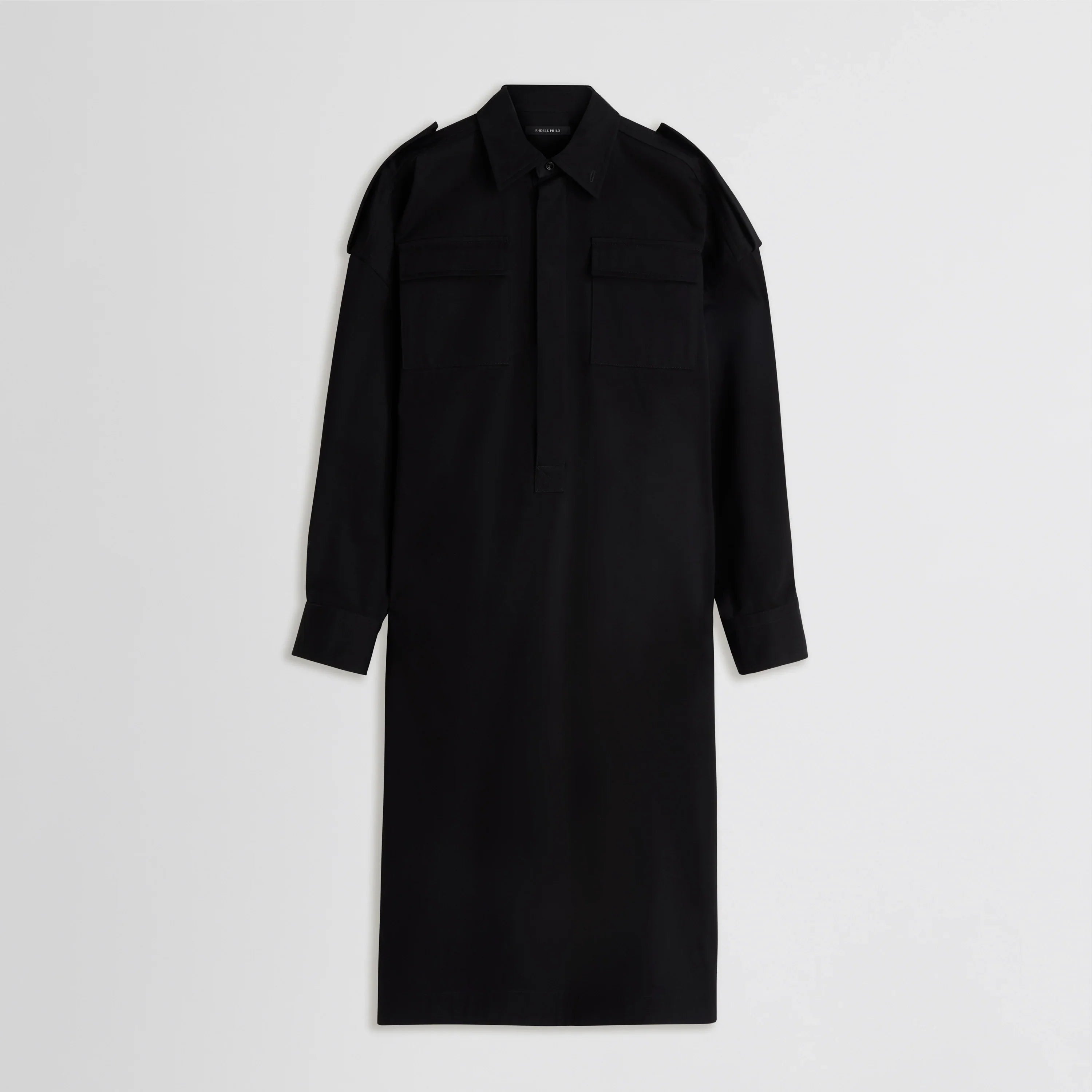 Utility shirt dress in black cotton. Mid-length with long sleeves, the dress has a belted waist, epaulettes and patch pockets on the chest. Covered button placket and side pockets. The fabric has a crisp finish.